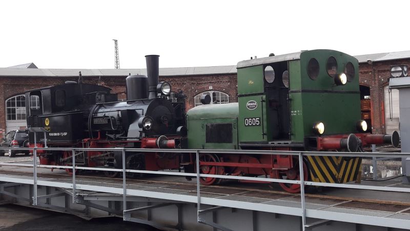 Die folgenden Bilder zeigen die Lok noch auf dem Spezial-Tieflader und nach dem Abladen im Schlepp einer Diesellok auf der Drehscheibe des Museums.