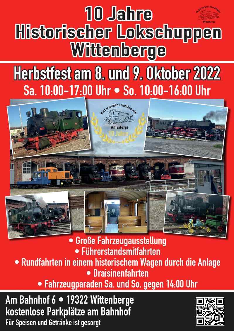 Wir möchten an dieser Stelle noch einmal die Werbetrommel für unsere Jubiläumsveranstaltung "10 Jahre Historischer Lokschuppen Wittenberge" rühren. Haben Sie sich schon den 8. und 9. Oktober 2022 im Kalender für einen Besuch bei uns reserviert? Geplant sind eine große Fahrzeugausstellung, Rundfahrten durch das Gelände und durch den Hafen Wittenberge, Draisinenfahrten und natürlich unsere Fahrzeugparaden am Nachmittag.