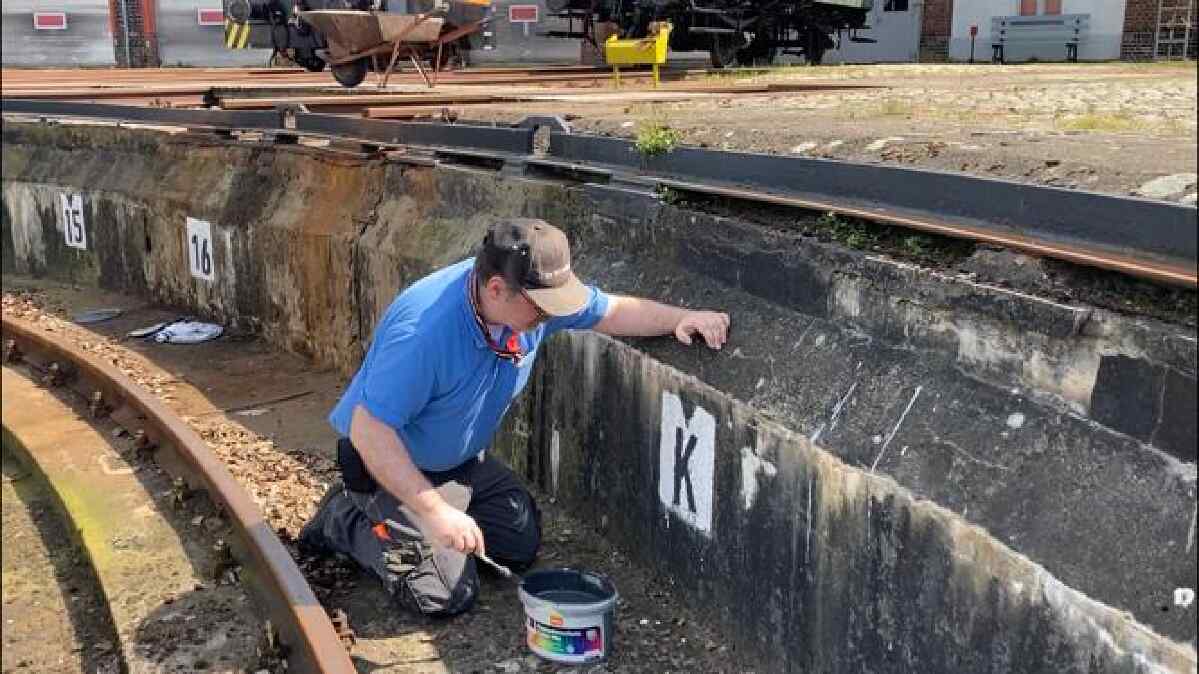 Mit ihrem Dampf kann dann die ölgefeuerte 01 509 in Betrieb genommen werden. Bis sie selbst Dampf erzeugen kann, vergehen noch einmal mindestens fünf Stunden. Die Zeit konnte aber genutzt werden, um noch letzte Schönheitsreparaturen an unserer Anlage vorzunehmen. So konnten die Positionsanzeigen in der Drehscheibengrube noch neue Farbe erhalten und die Rohre im Inneren des Kessels von Emma von Ruß befreit werden.