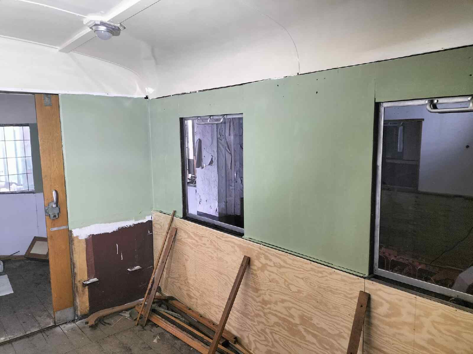 Auch an unserem Wagen 197 805 wurde weiter an der Inneneinrichtung gearbeitet. Nun sind die Wandisolierungen und Verkleidungen fertig gestellt und werden lackiert. Darin orientieren wir uns an der historischen Farbgebung. Das Fensterband erhält mehrere Lagen im hellgrünen Farbton, der auch einen Anteil beige enthält. Nachdem die Farbe getrocknet ist, werden Holzleisten angebracht, welche die Fugen zwischen den Wandpanelen verdecken.