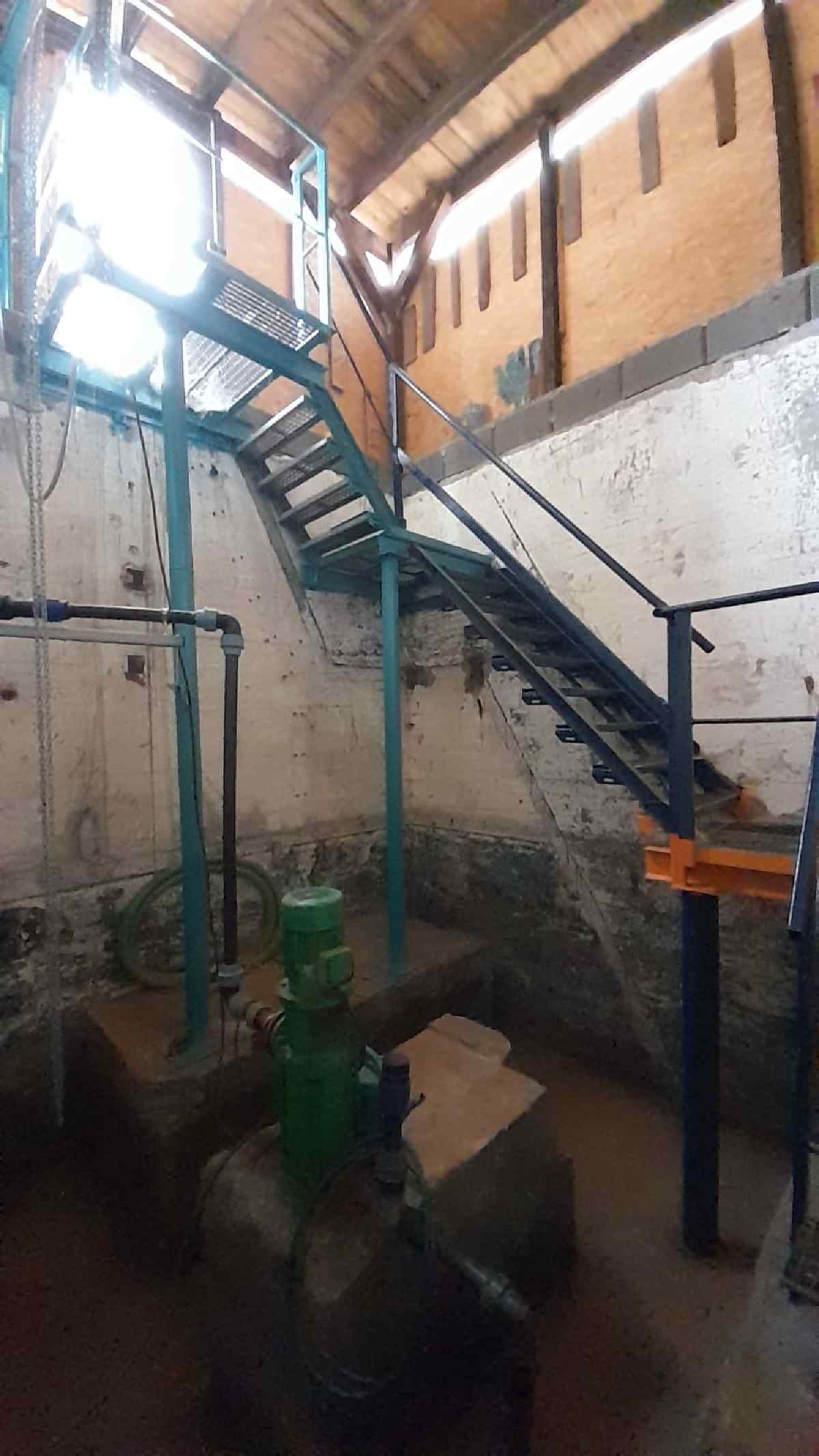 Oberhalb der Zwischendecke erreicht man den Vorratsbehälter. Eine weitere Treppe führt nach oben zum oberen Rand des Behälters