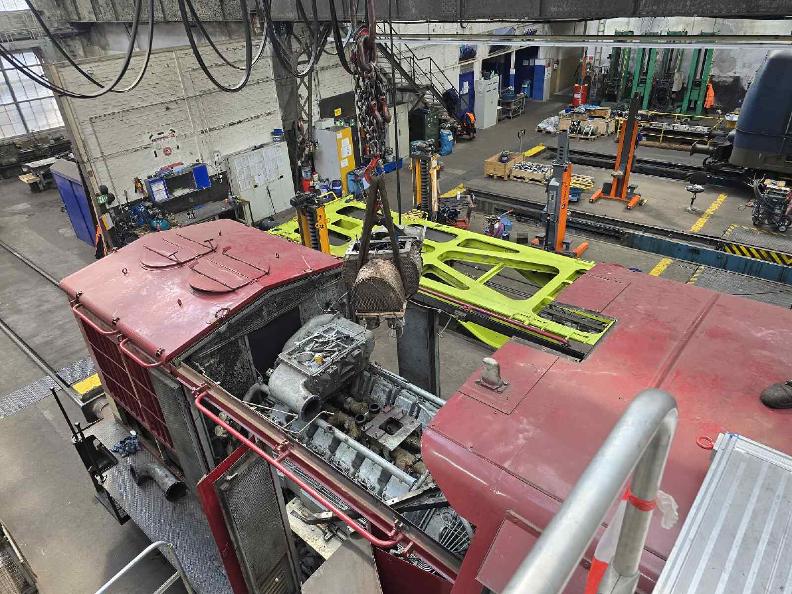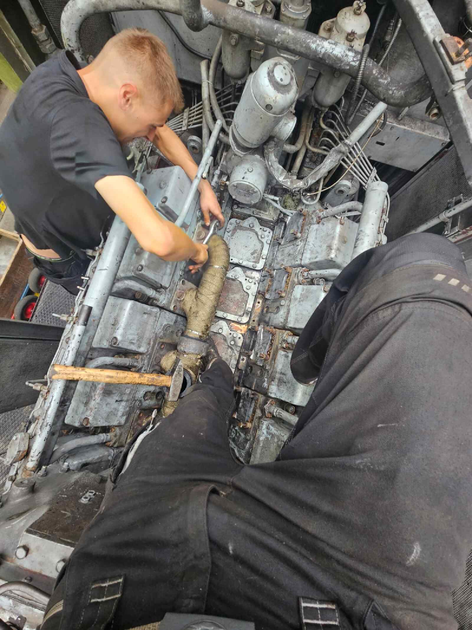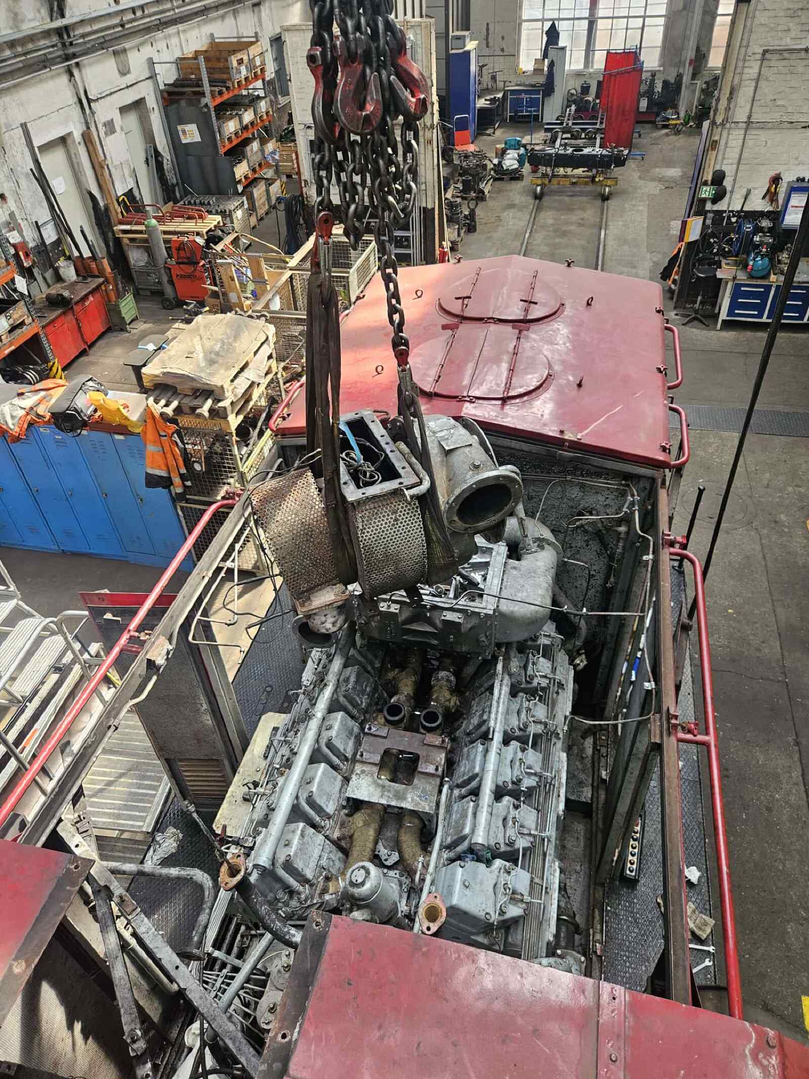 Wir berichteten bereits des Öfteren über die Aufarbeitung unserer Diesellok der Gattung V100.1, die die Nummer 114 774-3 trägt. Nachdem wir uns bereits vor einiger Zeit um das Fahrwerk und die Bremse der Lok gekümmert hatten, stand in den letzten Wochen der Motor im Mittelpunkt des Interesses. Für die Technik-Enthusiasten sei erwähnt, dass es sich um ein Aggregat des Herstellers VEB Kühlautomat Berlin-Johannistal handelt. Es erzeugt mit seinen 12 Zylindern und dem Turbolader eine Leistung von knapp 1.500 PS. Damit handelt es sich um die leistungsstärkste Motorvariante, die in Lokomotiven dieses Typs eingebaut wurde. Zwar war unser Motor seit der letzten großen Instandsetzung vor einigen Jahren nur ein paar Dutzend Betriebsstunden gelaufen. Allerdings waren im Laufe der langen Standzeit seit der Abstellung der Lok durch den letzten kommerziellen Eigentümer einige Undichtigkeiten am Turbolader aufgetreten, die zum Austritt von Öl führte. Bevor wir die Lok wieder einsetzen können, mussten diese Undichtigkeiten beseitigt werden. Dazu wurde der Turbolader und diverse andere Anbauteile aus dem Motorraum entfernt, um sie aufarbeiten zu können. Nachdem die Aufarbeitungen abgeschlossen waren, konnten sich unsere Diesellokfachleute wieder mit dem Zusammenbau beschäftigen. An diesen kleinen Bericht sind ein paar Fotos von der Aktion beigefügt. Wir danken an dieser Stelle herzlich den Schienenfahrzeugwerken Wittenberge für die Unterstützung. Demnächst werden die Arbeiten abgeschlossen. Wir freuen uns schon auf den Probelauf des Motors und der Lokomotive.