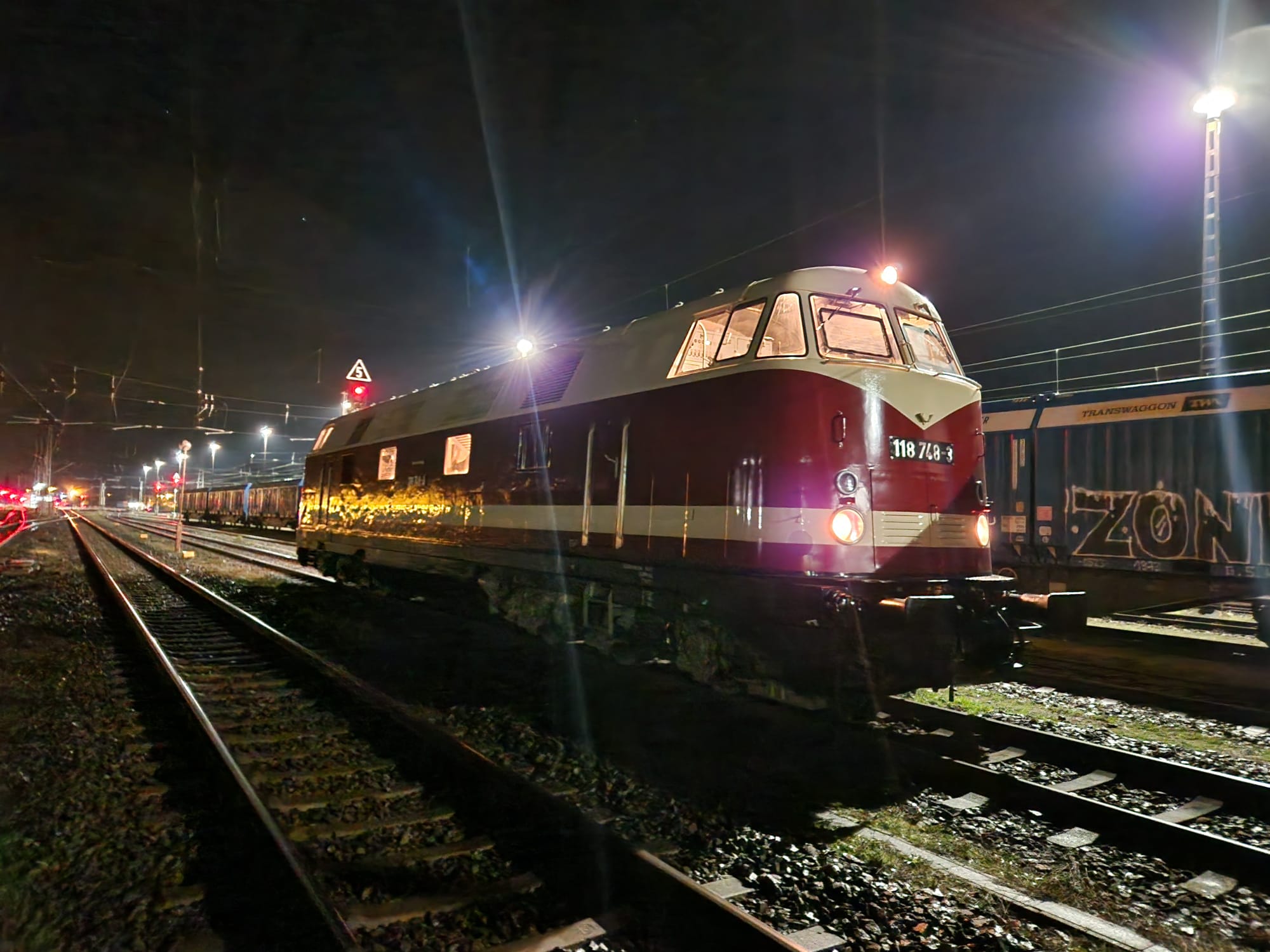 schon wieder ist ein Jahr vergangen und wir steuern auf Weihnachten und den Jahreswechsel zu. Natürlich denkt man dabei auch an Geschenke. Das tun wir auch. So freuen wir uns besonders über unser größtes Weihnachtsgeschenk dieses Jahr. Unsere Diesellok 118 748 ist nun wieder betriebsfähig. Ein paar Worte zu der Lok: Sie wurde 1968 bei beim VEB Lokomotivbau Karl Marx in Potsdam-Babelsberg gebaut, verfügt über zwei Dieselmotoren mit je 1.200 PS und darf maximal 120 km/h schnell fahren. Damit ist sie eine Universallok, die sowohl im Personen- als auch im Güterverkehr eingesetzt wurde. Nach ihrer Abstellung durch die Deutsche Bahn AG im Jahr 1999 wurde sie an die Mitteldeutsche Eisenbahn verkauft, die sie in 2020 an die Firma PRESS weitergab. Seitdem bereichert sie unsere Fahrzeugsammlung, bisher allerdings nur als funktionsfähiges Ausstellungsobjekt ohne Streckenzulassung. Im Jahr 2023 erwarb ein Mitglied unseres Vereins die Lok. In den letzten Monaten wurde sie grundlegend bei der Firma Malowa in Klostermansfeld am Ostrand des Harzes aufgearbeitet. Im Rahmen der Arbeiten wurden unter anderem die Motoren, Drehgestelle, Achsen und Bremsen instandgesetzt. Außerdem erhielt sie eine zeitgemäße Zugsicherungs- und Funkanlage, um sie auch für einen Einsatz auf Strecken der Deutschen Bahn AG zu ertüchtigen. Nach Abschluss der technischen Arbeiten hat sie in den letzten Tagen eine neue Lackierung erhalten hat und erstrahlt jetzt wieder im alten Glanz in rot/weißer Farbgebung. Die ersten beiden Fotos zeigen sie vor einigen Tagen noch in der Lackierhalle einer bekannten Eisenbahnwerkstatt in Klostermansfeld. Keine Angst, die schwarzen Streifen, die im Lack der Lok zu erkennen sind, reflektieren nur die Umgebung.