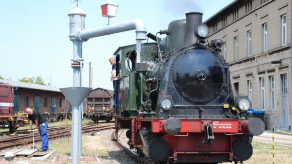 von WittenbergeMartina Kasprzak "Seit vergangener Woche haben wir auch den Wasserkran. In den Monaten zuvor haben wir eine 300 Meter lange Rohrleitung zum Wasserturm verlegt", erklärte der Vorsitzende der Dampflokfreunde Salzwedel, Burkhard Bohn. Und am Wochenende konnten die zahlreichen Besucher im Historischen Lokschuppen Wittenberge – an beiden Tagen waren es trotz der brütenden Hitze gut 500 – live mit ansehen, wie die Dampfloks mit Wasser aus dem Kran befüllt werden. Die kleine Emma, auf der die Besucher mitfahren durften, fasst an die sechs Kubikmeter Wasser. Sie wurde morgens und mittags befüllt. Die großen Loks benötigen um die 26 bis 28 Kubikmeter.